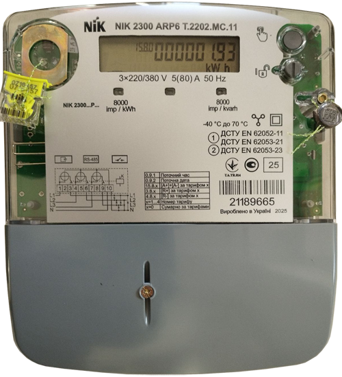 Счетчик NIK 2300 ARP6T.2202.МС.11 предназначен для измерения электрической активной и реактивной энергии (A+, R±), а также организации многотарифного учета электроэнергии в трехфазных трехпроводных или четырехпроводных цепях переменного тока, с прямым подключением по напряжению и току к цепям генератора и нагрузки. Работает при номинальном напряжении 3x220/380 В и силе тока 5 (80) А. Интерфейсы: импульсный выход, оптопорт, RS-485, реле нагрузки, датчик магнитного и электромагн. поля.