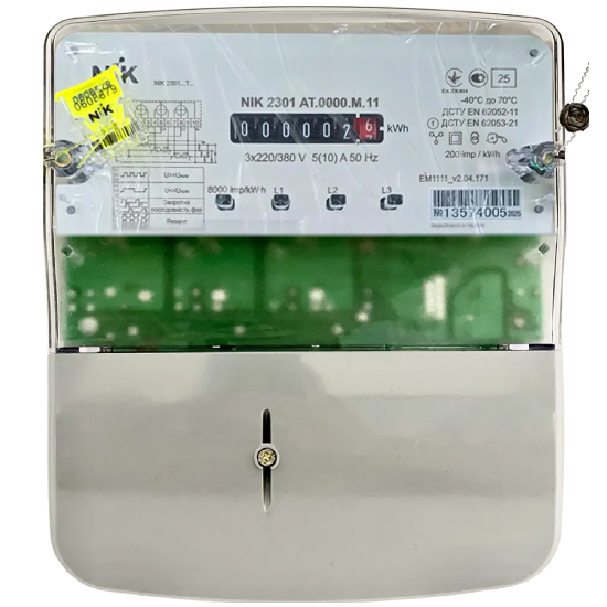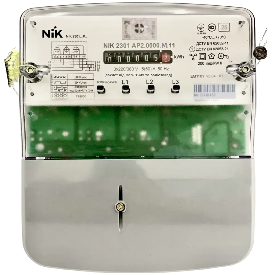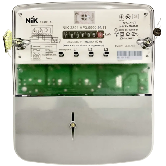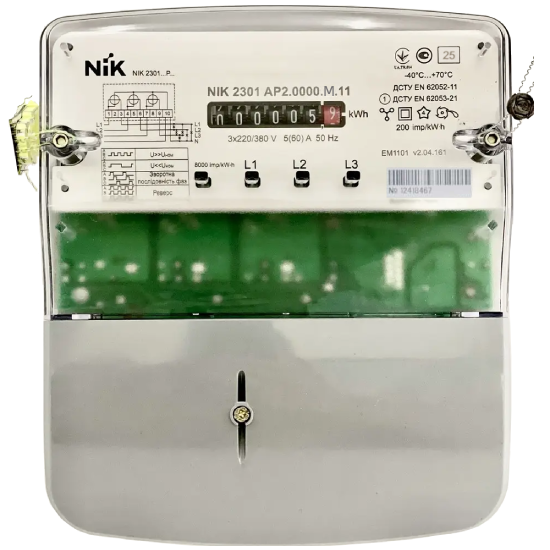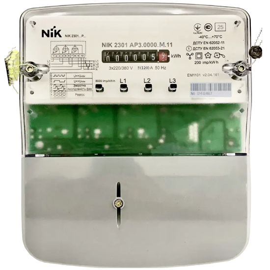 Счетчик NIK 2301 AP2.0000.M.11 (NIK 2301 AP2.0000.0.11) предназначен для измерения электрической активной энергии (A+) в трехфазных цепях переменного тока, с прямым подключением по напряжению и току. Работает при ном. напряжении 3x220/380 В и силе тока 5(60) А, имеет имп. вых, пломбу «МагнеТ» (захист від магнітних та радіозавад). Есть модели с региональными голограммами NIK.