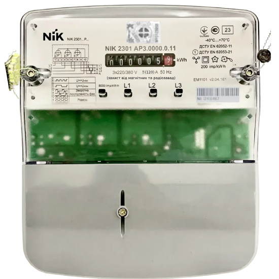 Счетчик NIK 2301 AT.0000.M.11 (NIK 2301 AT.0000.0.11) предназначен для измерения электрической активной энергии (A+) в трехфазных трехпроводных или четырехпроводных цепях переменного тока, с прямым подключением по напряжению и трансформаторным по току к цепям генератора и нагрузки. Работает при номинальном напряжении 3x220/380 В и силе тока 5 (10) А, имеет импульсный выход, пломбу «МагнеТ» (захист від магнітних та радіозавад). Есть модели с региональными голограммами NiK.
