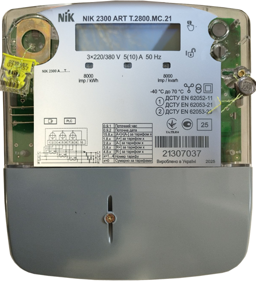 Счетчик NIK 2300 ARTT.2800.MC.21 предназначен для измерения электрической активной и реактивной энергии (A±, R±), организации многотарифного учета энергии в трехфазных цепях переменного тока, с прямым подключением по напряжению и трансформаторным по току. Номинальное напряжение 3x220/380 В, сила тока 5 (10) А. Интерфейсы: импульсный выход, оптопорт, PLC-модем, датчик магнитного и электромагнитного поля
