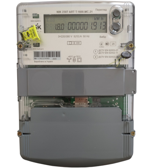 Счетчик NIK 2307 ARP6T.1600.МC.21 предназначен для измерения электрической активной и реактивной энергии (A±, R±), а также организации многотарифного учета энергии в трехфазных трехпроводных или четырехпроводных цепях переменного тока, с прямым подключением по напряжению и току к цепям генератора и нагрузки. Работает при номинальном напряжении 3x220/380 В и силе тока 5 (80) А. Модель имеет встроенные интерфейсы: импульсный выход, оптопорт, GSM-модем, датчик магнитного и электромагнитного поля.