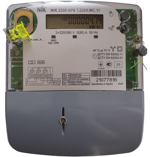 Счетчик NIK 2300 AP6T.2200.МC.11 предназначен для измерения электрической активной энергии (A+), а также организации многотарифного учета электроэнергии в трехфазных трехпроводных или четырехпроводных цепях переменного тока, с прямым подключением по напряжению и току к цепям генератора/нагрузки. Номинальное напряжение 3x220/380 В, сила тока 5 (80) А. Интерфейсы: импульсный выход, оптопорт, RS-485, датчик магнитного и электромагнитного поля.