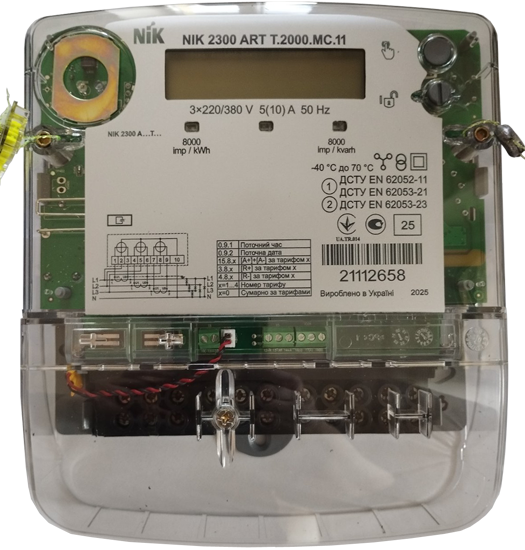 Счетчик NIK 2300 ARTT.2000.МC.11 предназначен для измерения электрической активной и реактивной энергии (A+, R±), а также организации многотарифного учета электроэнергии в трехфазных цепях переменного тока, с прямым подключением по напряжению и трансформаторным по току к цепям генератора и нагрузки. Номинальное напряжение 3x220/380 В, сила тока 5 (10) А. Интерфейсы: импульсный выход, оптопорт, датчик магнитного и электромагн. поля.